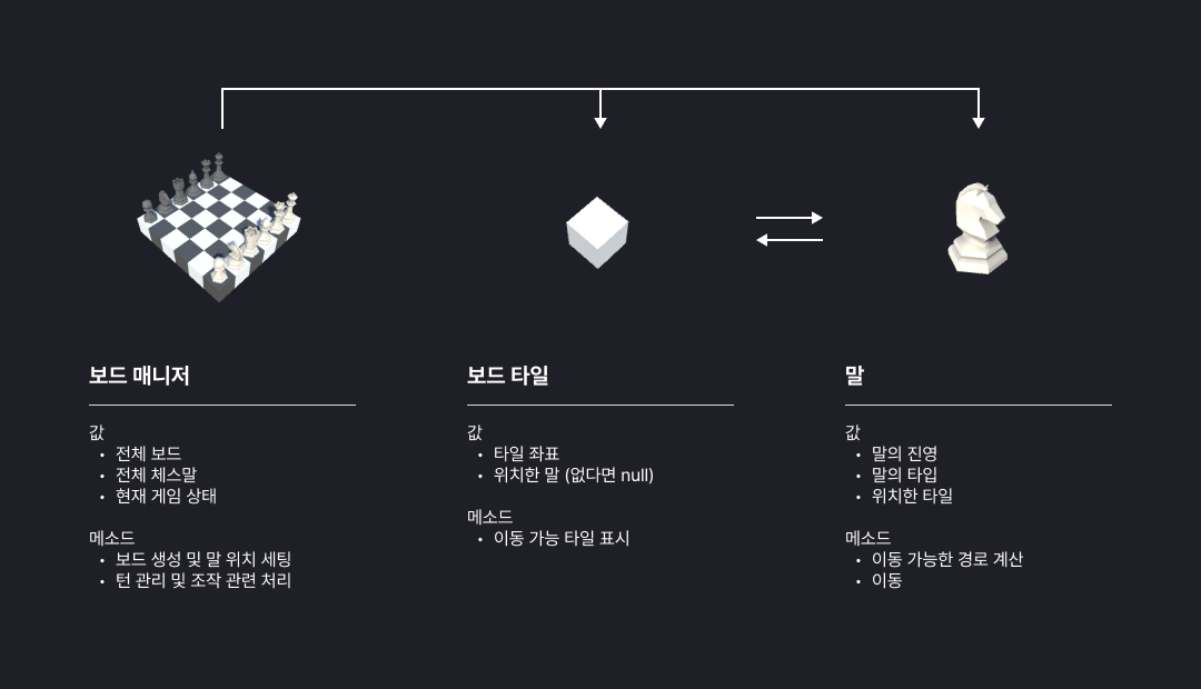처음 구조를 짰을 때엔 보드 매니저에서 말의 이동 로직과 이동 모두를 처리하는 것으로 생각했는데, 체스 말 별로 다른 이동 로직을 모두 보드 매니저에서 처리하려니 코드가 너무 길어져 보기도 불편하고 구조도 조금 이상한 것 같아 이동 관련은 모두 말에서 처리하도록 수정했습니다.