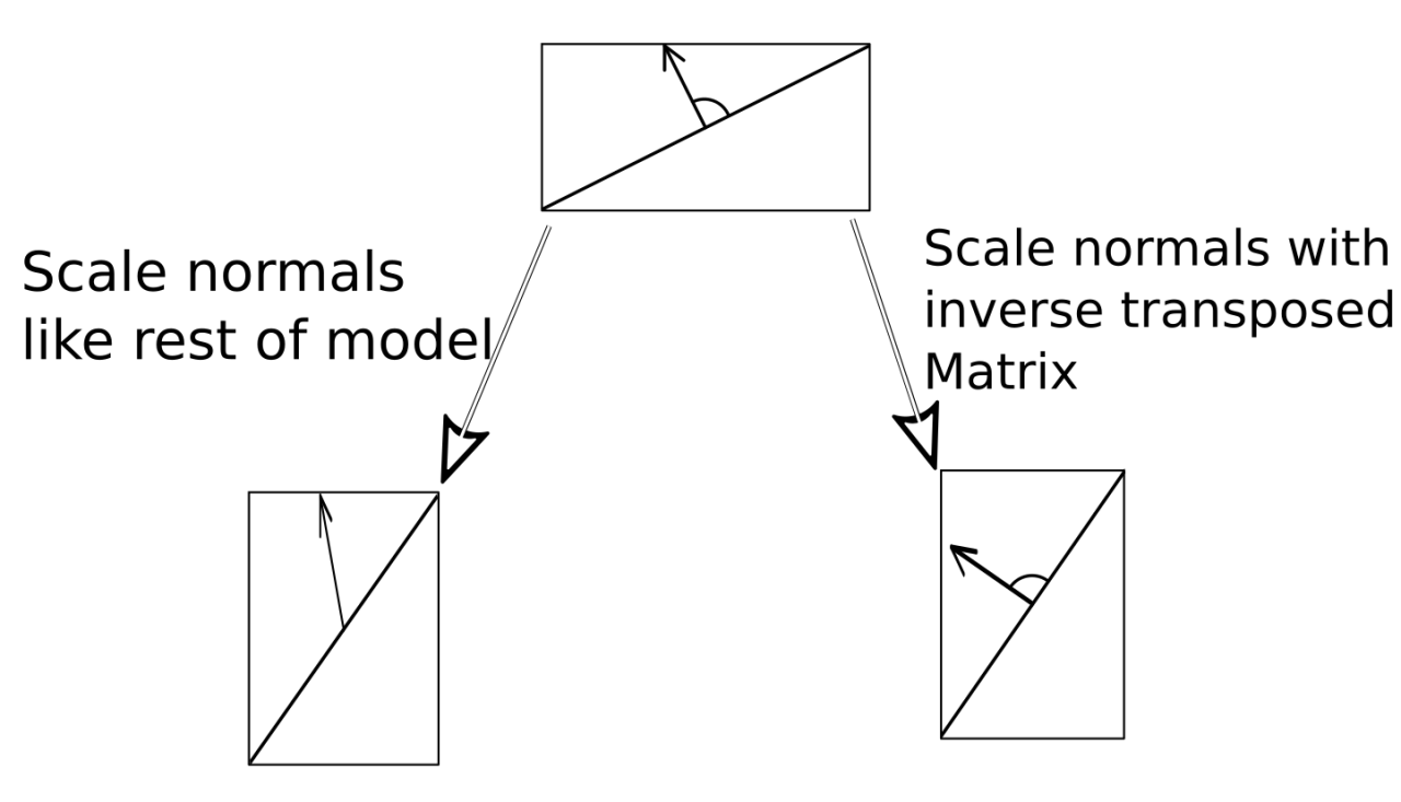 노말은 표면에 수직입니다. 그래서 X축으로만 크기를 조절했을 경우 표면은 가파르게 되는데, 같은 방식으로 노말을 변환하면 노말 값은 이전보다 더 위를 향하게 되어 더 이상 표면으로부터 수직이 아니게 됩니다. 대신, 표면이 가팔라지는 만큼 노말을 더 플랫하게 만들어줘야 하는데, 역전치행렬이 이를 수행해줍니다. 그런 다음 행렬을 3x3 행렬로 변환해주고, 노말을 움직이는 부분들을 제거해줍니다. (노말값이 위치값 대신 방향을 나타내기 때문에, 노말을 움직이길 원하지 않습니다.)